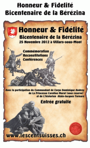 Honneur & Fidélité, Bicentenaire de la Bérézina, 25 novembre 2012, Monument Villars-sous-Mont (100 m de la gare) Cortège vers la Place d’Armes de Grandvillard, (restauration et boissons sur place), commémoration, reconstitutions, conférences. Dés 11.00h.