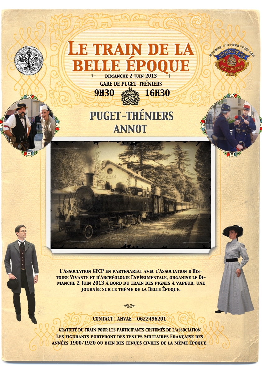 L’Association d’Histoire Vivante et d’Archéologie Expérimentale en partenariat avec l’Association GECP, organise le Dimanche 2 Juin 2013 à bord du train des pignes à vapeur, une journée sur le thème de la Belle Époque.